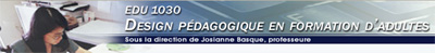 Enfin, pour conclure, voici quelques mots particuliers de remerciements de Josianne Basque à des collaborateurs/trices qui l'ont soutenue dans le processus de création de ce cours. « Je tiens à remercier toutes les personnes qui m'ont conseillé, appuyé et soutenu durant la conception de ce cours. Merci à Paul-André Martin, professeur à l'Université du Québec en Abitibi-Témiscamingue, Sylvie Doré, professeure à l'École de technologie supérieure et Michèle Larose, consultante en technologie éducative, qui ont collaboré à la préparation du devis d'une version préliminaire du cours. Merci à Josée Garant et Colette Laprise pour les démarches entreprises en vue de l'obtention des droits d'auteurs. Merci à Sonia Bélanger, Jacques Bernard, Claude Champagne et Selim Kfoury, pour avoir accepté de livrer, dans une entrevue filmée, leur expérience du design pédagogique dans leur milieu respectif de travail et nous avoir ainsi permis de réaliser des vidéoclips de grande qualité et d'enrichir le contenu pédagogique du cours. Merci également à Danielle