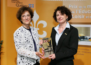 Prix de la ministre de l'Éducation, du Loisir et du Sport Québec - Josianne Basque, professeure à l'UER Éducation, a reçu, mercredi le 6 juin dernier à l'Hôtel de Mortagne à Boucherville, une haute reconnaissance : le Prix de la ministre de l'Éducation, des Loisirs et des Sports 2006-2007 pour le cours EDU 1030 - Design pédagogique en formation d'adultes. La remise des prix aux lauréates et aux lauréats du concours annuel a pour but de souligner l'engagement et le dévouement avec lesquels les membres des réseaux collégial et universitaire se sont illustrés en matière de création de matériel didactique et de recherche pédagogique en français, et de leur rendre hommage.